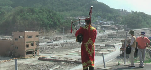 そしたら、「今日、私の家の取り壊し開始日なので、見に来たんです。家族はここの 2階で死んだんです」という男性が話しかけてくれた。バグパイプ吹きが被災地をま わっていることは新聞で知っていたという。「そしたら、そのホンモノが自分の家の 取り壊し開始日に聴けるって、なんか不思議なものを感じます」と。 |