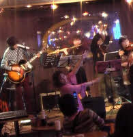オフィス街、大門浜松町駅の近くという地勢上、日曜休日のお客さんが少ないと いう事情があり、日曜イベントに大騒ぎ盛り上がりユニットの「キュイート ピー=さっちゃんと音もだち隊」の出番となった。そして、日曜にしては、かな りお客さん入ってくれたね。 2012年1月29日、日曜日 でも、平日は、すごい大混雑だそうで、平日には、ギンバンドというレギュラー バンドがやっているそうです。 |