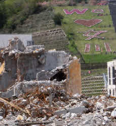 2012年5月5日。 女川町の町役場のあたりからフェリー乗り場のほうなど。 バグパイプ隊は、歩き回りに歩き回る。 |