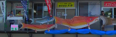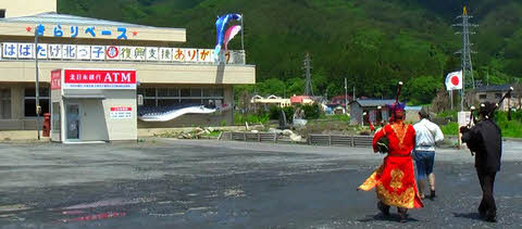 大槌北小福幸きらり商店街では、 ほとんど事前告知宣伝ナシでの突入でしたが、たくさんの人が仕事や食事をほっ ぽらかして見にきてくれました。こういうバグパイプ効果のあとだと、他の ミュージシャンもやりやすいでしょ。 その後、「おおつちありがとうロックフェスティバル」とかに繋がる。 |