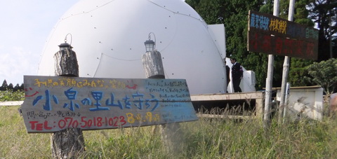 こちらは、集会場。 かなり強い風にも耐えられる構造で、 カナダなど外国からの支援だという。 以上撮影:2012年10月14日 小泉自然学校 311被災の直後から、いろいろなボランティアが現地入りをしようとしたと き、受け入れてもらえない地域が多かったという。そんな中で「ここ小泉地域が 最初に受け入れてくれた地域でした」という団体が2つあった。 実体のある支援をしている団体は、受け入れの点で苦労してスタートしたよう だ。バグパイプ隊が、たいがいのところで受け入れられているのは、それほど益 にも害にもならない「空気作り屋」だからなのであろう。でも、文化や文明は、 益にも害にもならないところから生まれるものかも? ここ、小泉自然塾の紹介で、 11月11日に、道の駅大谷海岸でランチ音楽会の開催に至った。 今度は、このドーム小泉学校でもバグパイプの爆音を轟かしたいね。 |
