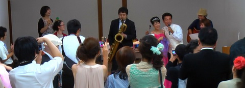 結婚披露宴は、スタートでガツンと盛り上げるためには、 轟音バグパイブによる入場がいい。 今回の結婚式では、お祝いの言葉をスピーチする人が2時間遅刻でナシになり、 冒頭乾杯挨拶役の新婦さん両親が、近所に散歩に行ってて連絡が取れなくなるな ど、楽しいハプニング続出でしたが、バグパイプの轟音で全て帳消し。 |