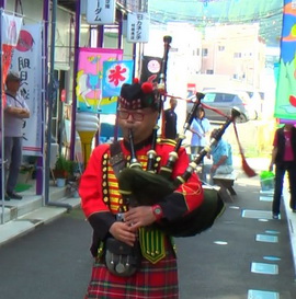 仮設住宅でバグパイプやってたら、 近くの紫商店街から「商店街でもやってくださいよ」と 追加注文がきた。午後4時スタートで。 土曜日にしてはお客さん少ないので、景気づけに・・。 |