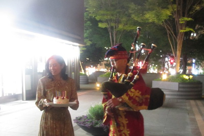しかも、ここ霞が関ナレッジスクエアでは、店外の広場からのバグパイプ演奏入 場もオーケーだったので、誕生日ケーキとともに、虎の門駅の方から入場。 |