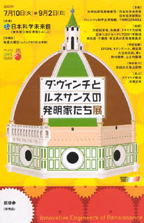 「ダ・ヴィンチとルネサンスの発明家たち展」 日本科学未来館 東京都江東区青海2-41-3 2001.7.10 → 9.2 (チラシより) レオナルド・ダ・ヴィンチは天才的な芸術家としてだけでなく、 科学者、エンジニア、建築家としても知られています。自由な 発想が歓迎されたルネサンス期には、ダ・ヴィンチをはじめと する天才たちが万能の力を発揮し、歴史に残る大発明が数多く 生まれました。 本展では、ルネサンス発祥の地フィレンツェにそびえる、ブル ネレスキ設計のサンタ・マリア・デル・フィオーレ大聖堂の クーポラ(丸屋根)、ダ・ヴィンチが考案した飛行機械や工学機 械の模型、歴史上最初の人体解剖図の再現、さらにはダ・ヴィ ンチが登場する背景となったシエナ地方のエンジニアたちの業 績などが展示されます。 現代にいたる先端工学の基礎となった、これらのルネサンスの 発明や発想を、ユニークな模型、資料、マルチメディアなどで 分かりやすく紹介します。 |