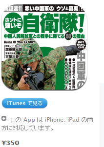 緑色のが1冊目。 赤いのが2冊目。 間違えて同じの買わないように・・・(買ってくれてもいいけど)。 (緑色のが1冊目にリンク) http://www.higashi-nagasaki.com/e_pub2007/EE2010_11jieitai.html 赤い2冊目の原本は、2009年3月発売でしたが、その直後の北朝鮮ミサイル発射 によって、2〜3週間で4万部売り切って消滅していたので、買い逃した方、チャン スっ! |