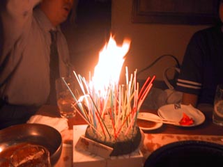 儀式と言えば、燃えるろーそく。したたる蝋。 これを「も〜えろよもえろ〜」と歌いながら吹き消す。 ビブラートのきかせ方がポイントだ。 そして繰り返し20回。 |