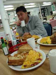 このオムレツのでかさは如何?コーヒーも何杯でもどうぞ。 オーロラ観測を終えて、エリオットハイウェイ沿いのHIll Topに寄って この朝食を食べるのが東長崎機関流?2002年3月14日午前6時(アラスカ時間)