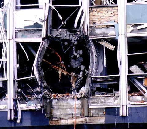 オフィスビルのため、ビル内部で爆発されたことによる被害の範囲は広い。ビル内部の壁 などは、ミサイル攻撃を考慮した設計にはなっていないはずだし。 |