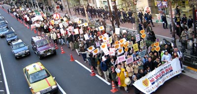 2003年3月8日、イラク攻撃反対デモが日比谷公園から銀座へと進んだ。 |