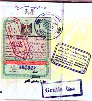 おっと、彼らを「人間の盾」だと即断するのは浅はかですぜ。 この3人の持つビザはコレ、イスラム義勇兵ビザというヤツ。 下にある「Gratis」というスタンプが、そのこと示しているらしい。 そして、この「Gratis」メンバーがバグダッド南方戦線でなにをしでかしたかは 後日アップします。 |