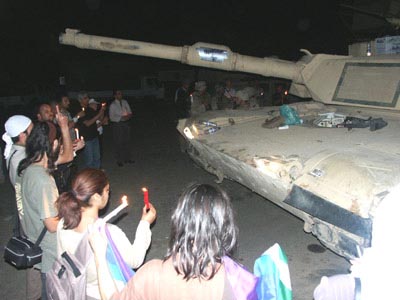 2003年4月11日、米軍第1海兵遠征隊のM1A1エイブラム戦車1台を借りて、盾 団は、キャンドルイベントをやった。その場交渉なのに戦車を貸してくれたよアメリカさ んは。砲塔を横向きにしたり砲身を動かしてくれたりとムード出してくれちゃって。この 直前にこの同じ場所では自爆攻撃で米兵4人が負傷していたのに。 |
