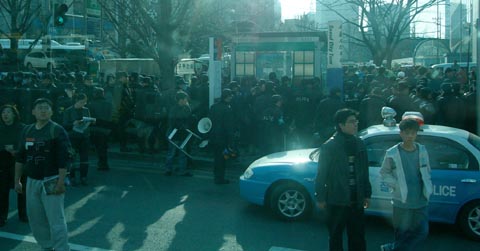 2004年3月20日16時35分。ソウル世宗路付近に機動隊の車らしきバスが 多重駐車していた。 |
