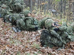 みちなき道を離脱する戦闘隊 行動訓練が開始されてからの取材は取材する方にも、体力的な面で苛酷な 状況下となった。 もっとも現役の頃から遠く年齢も重ね不摂生ばかりしている私にとって の話ではあるが。 山地での襲撃・伏撃を行った後は「離脱」となるが、ようするに「事を やらかして逃げる」ことで、ひたすら走るのである。 |