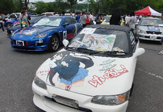会場には「痛車」が集まり出した、「いたしゃ」と呼ばれる自動車やバイクにアニメ