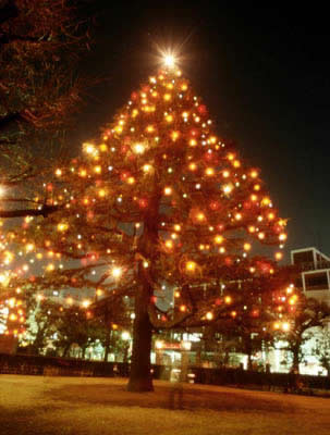 大学構内にある巨大なモミの木には、色とりどりのマメ球ではなく 大きな電球がぶらさがっている。記念写真を撮る人が多いのだが、 近くだと、「頭上に電球 写真」になってしまう。かといって 木の高さより狭い、塀に囲まれたエリアに立つ木だから、遠くから写せない。(池袋)