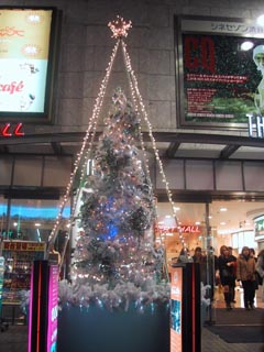 左から、渋谷パルコ、渋谷マークシティ、渋谷プライム。今年の渋谷は青白い木が好き? そういえば、赤いデコレーションが定番だった東急本店前の巨大ツリーは、今年から 姿を消していた。 |