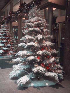 ランドマークタワーのロビーにどかんと置いてある木。オフィスの入り口空間 の割に、気合十分の大きさなのだ。 |