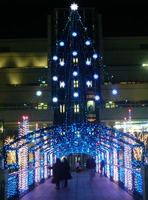 横浜ランドマークタワーを見上げるドックヤードガーデンは、青いイルミネーションで 幻想的な雰囲気になっていた。