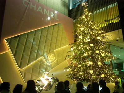 数寄屋橋のソニービルは、2002年に引き続き、ぎらぎらゴージャスなシャネル・ツリー。 すっかり観光名所もんね。今年のオーナメントはマトラッセ。