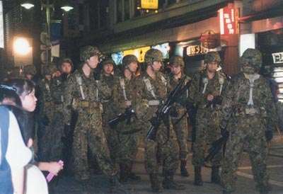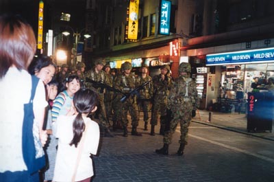 道路のど真ん中に、銃を持った兵隊さんたちが整列・・・